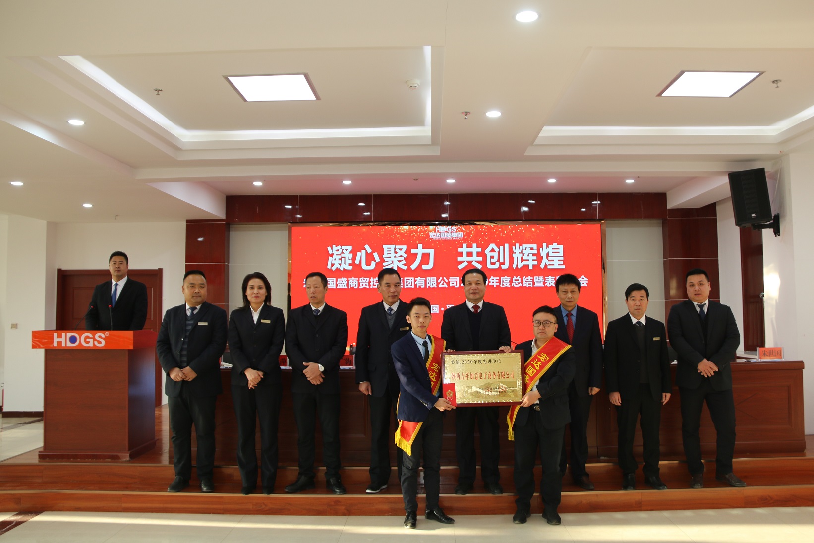 會議在嘹亮的《宏達國盛夢》中拉開序幕。會上,集團副總裁高生毅宣讀《宏達國盛集團經理會人員組成及分工》;集團副總裁陳曉慧宣讀《宏達國盛集團關于表彰2020年度先進單位、先進集體和先進個人的通報》,隨后舉行了頒獎儀式。集團銷售冠軍胡芳、陜西吉祥如意公司商學院院長何炬,宏達國盛電子商務公司總經理黃斌飛,分別代表先進單位和個人發(fā)表獲獎感言。