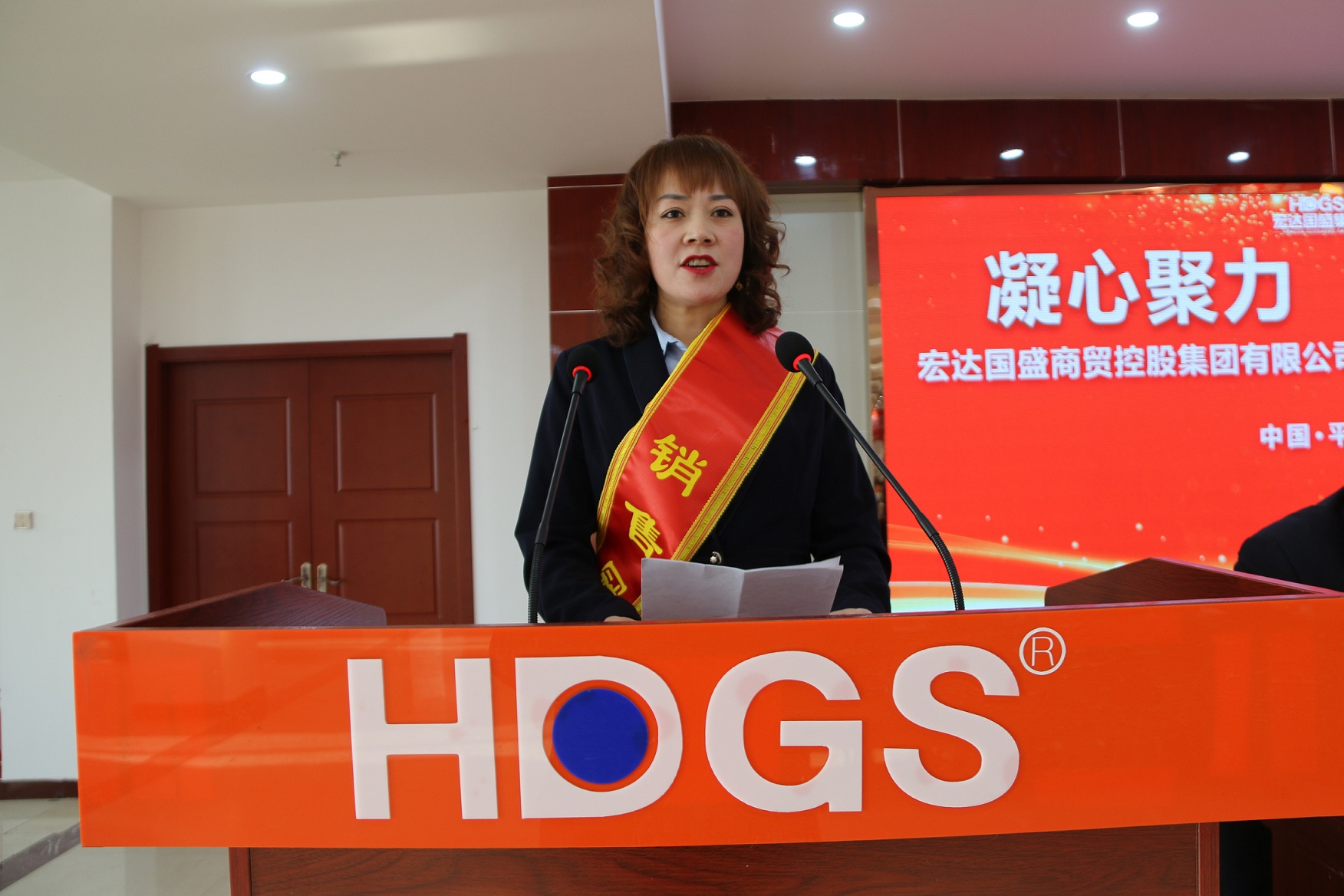 集團副總裁陳曉慧宣讀《宏達國盛集團關于表彰2020年度獲獎名單》文件