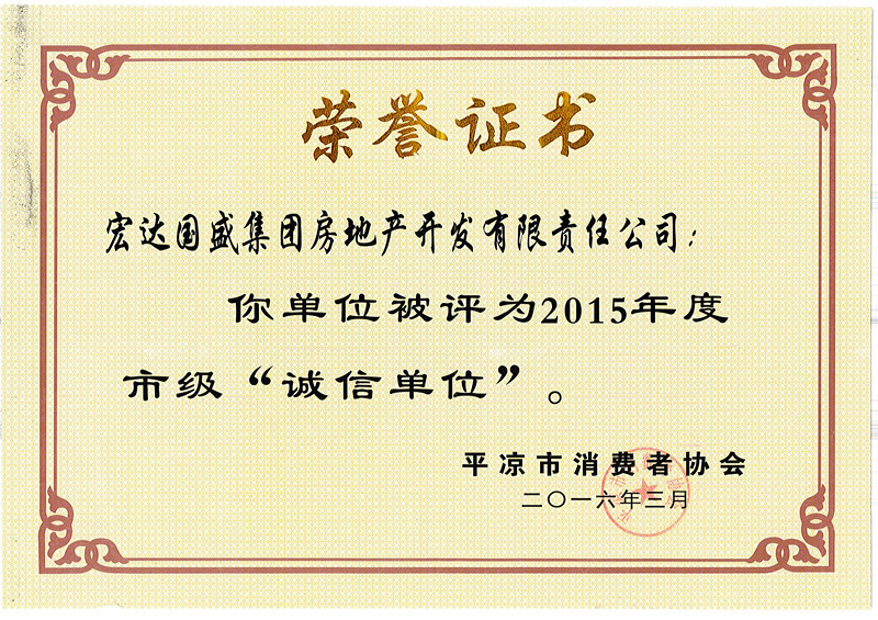 宏達國盛集團房地產(chǎn)開發(fā)有限責任公司榮獲2015年度市級“誠信單位”